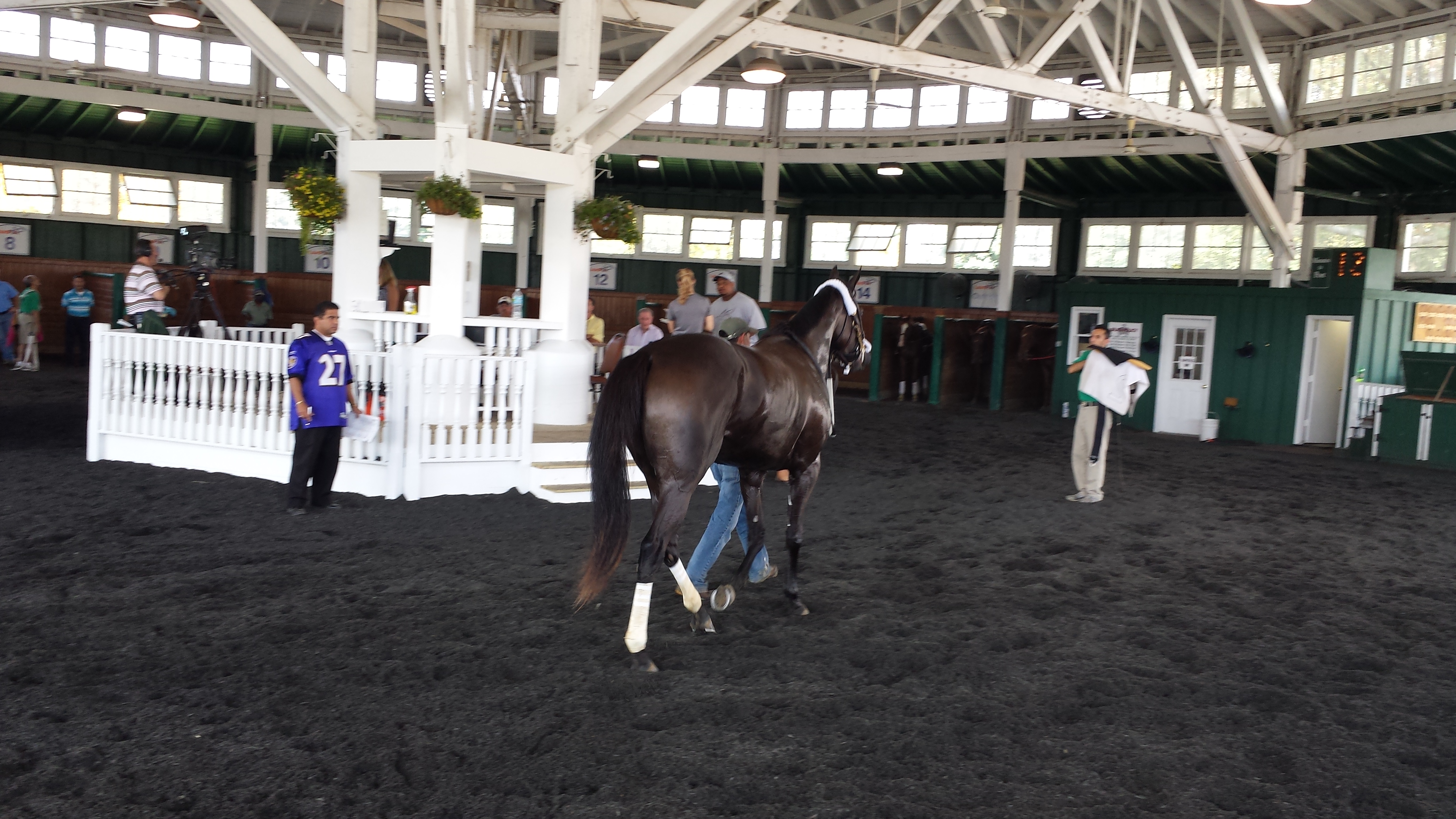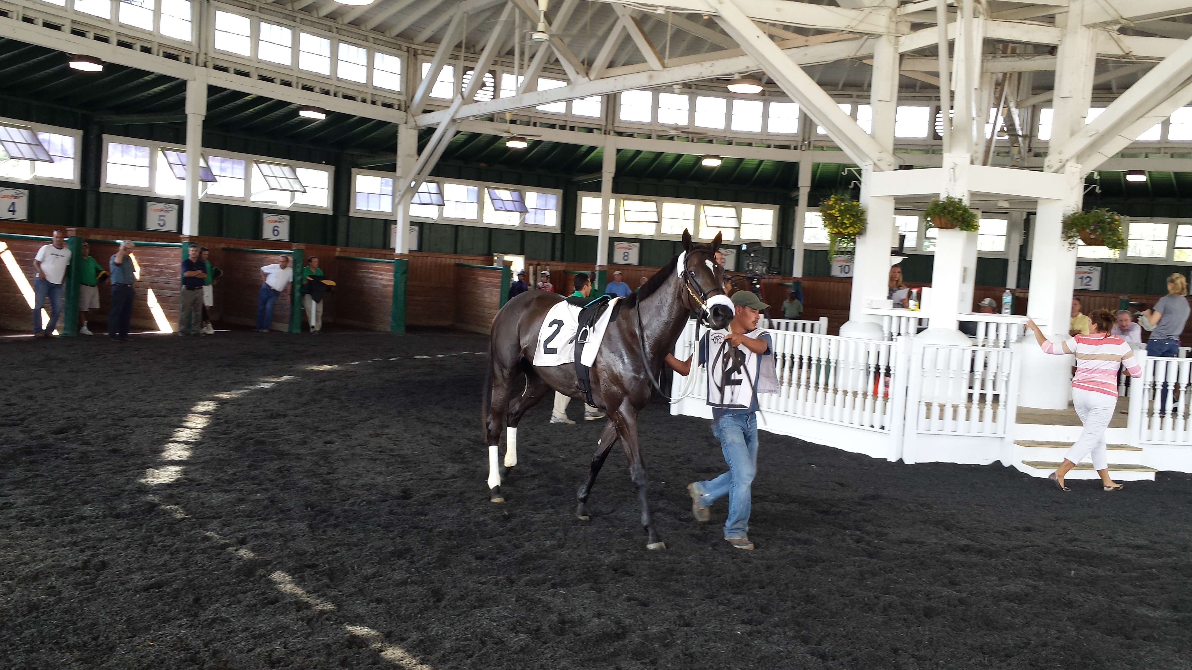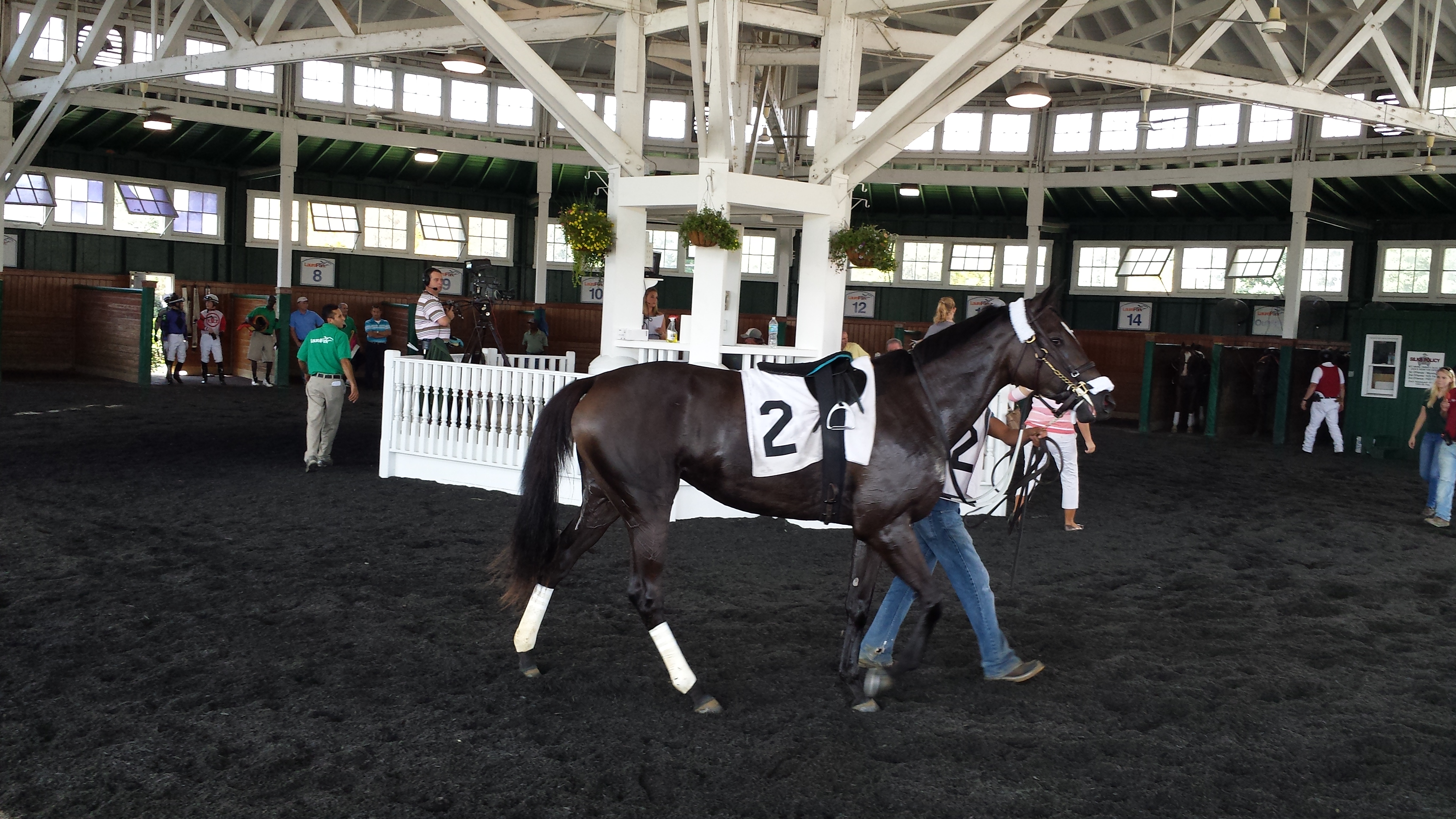 The assistant trainer who ran her got her to the paddock first. She had a few minutes there by herself to take things in. They saddled her on the move, which I think is because she has a tendency to kick the walls around her if she’s kept still. It looks really tough to get the saddle on correctly as the trainer and valet are running along beside the horse.