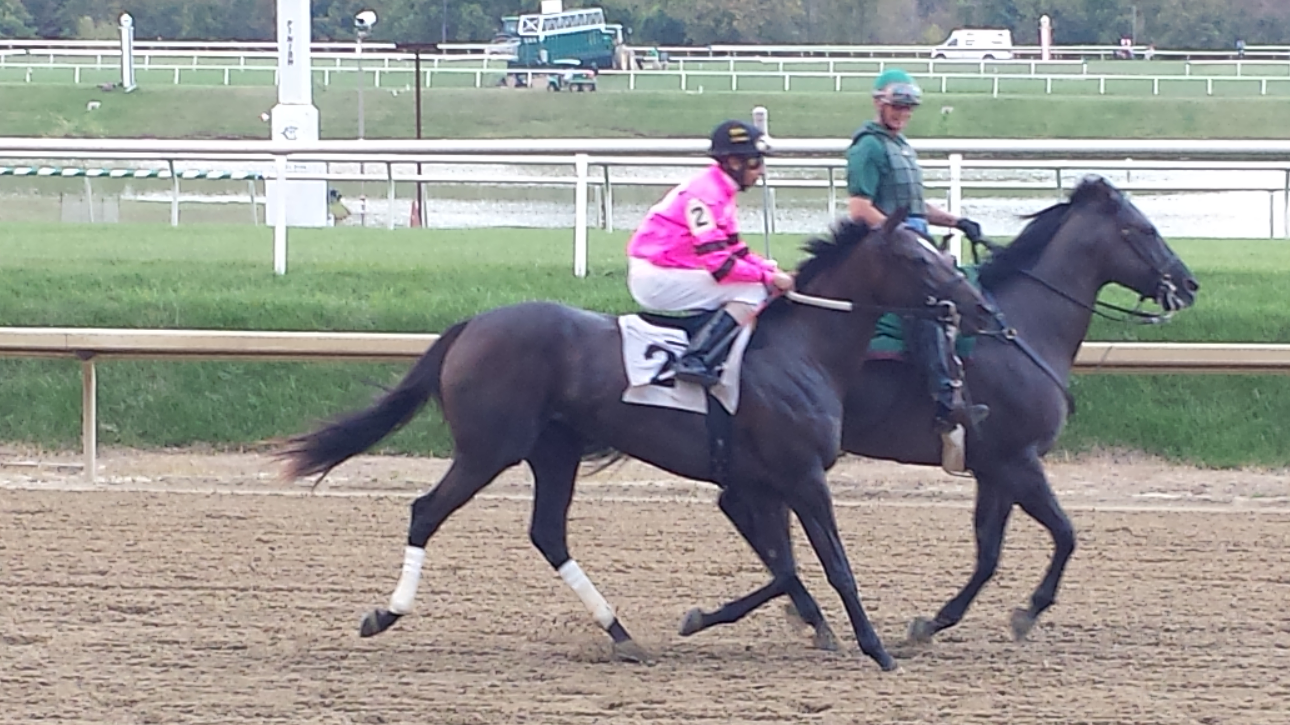 The #10 horse flew to the front, and the #3 horse was right up there with it. Sassy sat about 2 strides off of the leader- stalking the pace a bit, but right in contention. Julian let her race comfortably along the inside, saving ground.