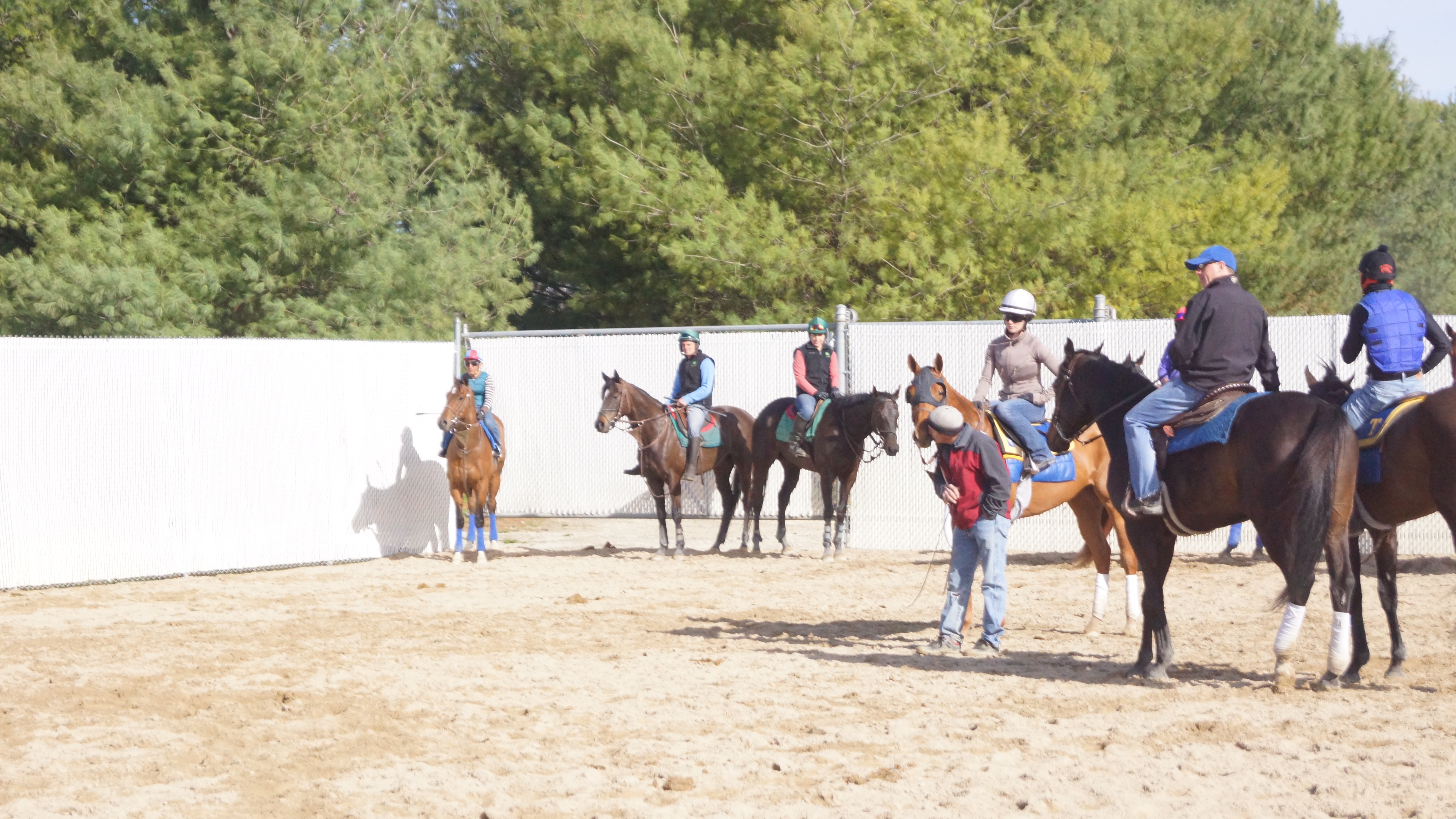 Sassy and her company galloped around to warm up, and then they came back to the crowded gate area where a bunch of horses were schooling the gate.